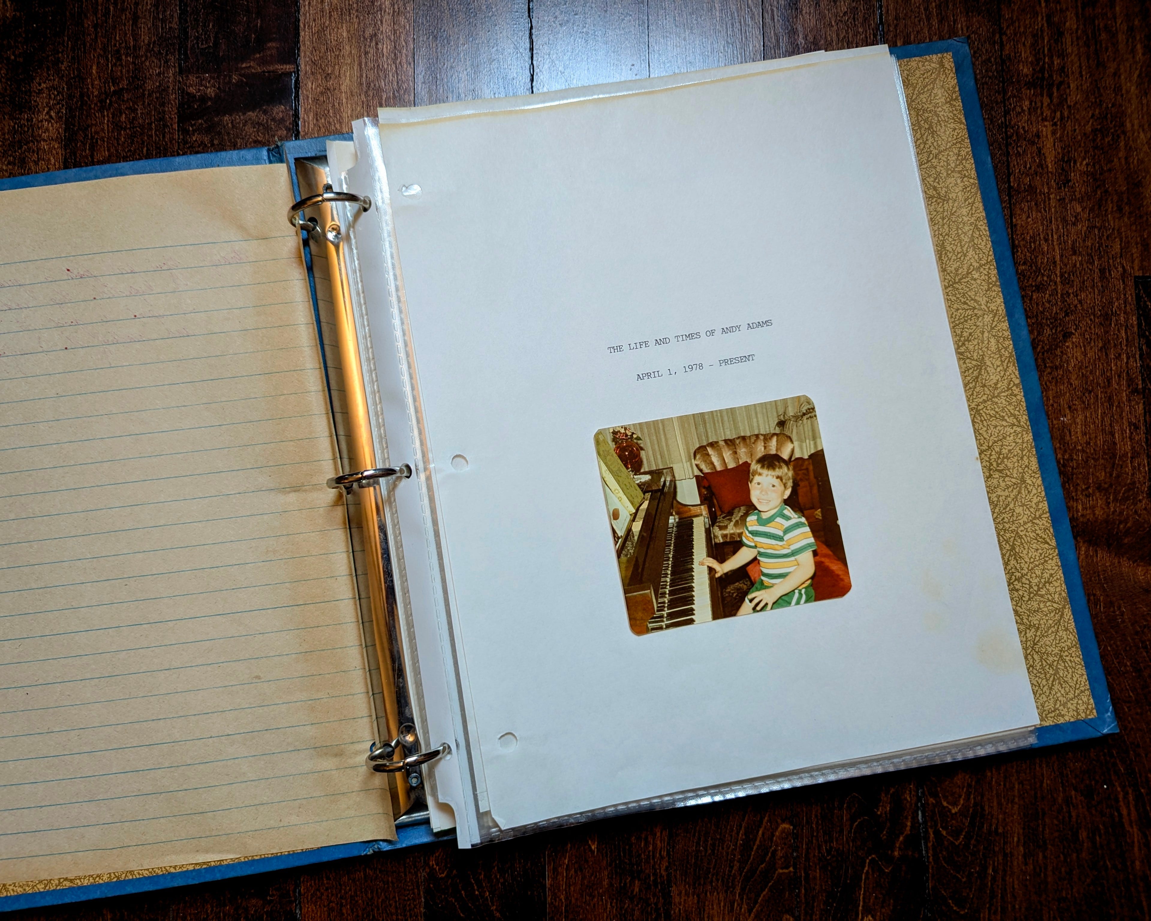 I also forgot about this: in sixth grade, we were assigned to write an autobiography, and I titled mine “The Life and Times of Andy Adams: April 1, 1978 - Present,” with this photo pasted on the cover. Even at twelve, I was writing with pictures. What a little goofball! Let me tell you, this thing is a riveting read.