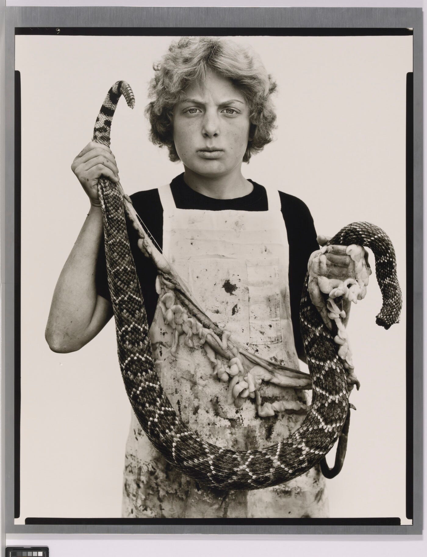 Often, the critical response was a critique of Avedon's outsized personae. As one of his era's most successful and highly-paid advertising photographers, he moved through the world with extreme confidence and bravado. And some thought that such a successful commercial photographer had no business mucking around in that hardscrabble part of the American West from which Avedon drew many of his subjects. The results could only be exploitative, they reasoned. But the psychological, gestural, and behavioral nuances that Avedon drew from his subjects placed in front of seamless white paper taped to the side of buildings in various locations where he made the portraits were, to my mind, anything but that. On the gestural and behavioral level alone, the pictures subvert the seeming limitations of their circumstances and the body's capacity to respond in a range of ways in front of the camera. After all, how many things can one do with a person standing in front of white seamless backdrop paper? A lot, actually, and Avedon's pictures are proof of their constant reinvention of human behavior in front of the camera, which is part of the work's brilliance.