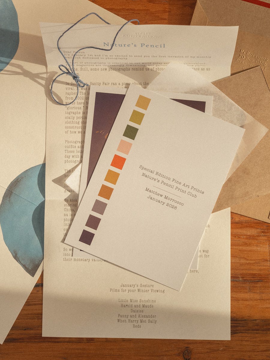 The title of my print club, Nature’s Pencil, comes from the first ever published book of photographs, “The Pencil of Nature,” by Henry Fox Talbot, where he discusses the camera’s ability to render nature more accurately than a pencil. Published in 1844, “The Pencil of Nature” was intended to showcase photography’s grandiose possibilities as an artform.
