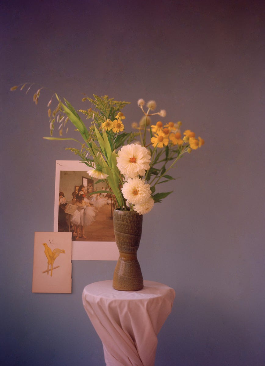 To kick things off, I am sending you a photograph that I made in 2023 when I started learning Ikebana, the ancient art of arranging flowers. Invented in China, and safeguarded from the 7th century until today by the Japanese, ikebana is an artform used to find peace in living with nature. Shot on 4x5 film, this photograph is made with white dahlias from True Love Farms, a 19th-century lithograph from a book on canaries I purchased in London, a cutout from a book on Degas, and a blue gradient background I made myself. As January begins, I thought you might enjoy this delicate little photograph as a reminder of the value art can have in resonating across time.