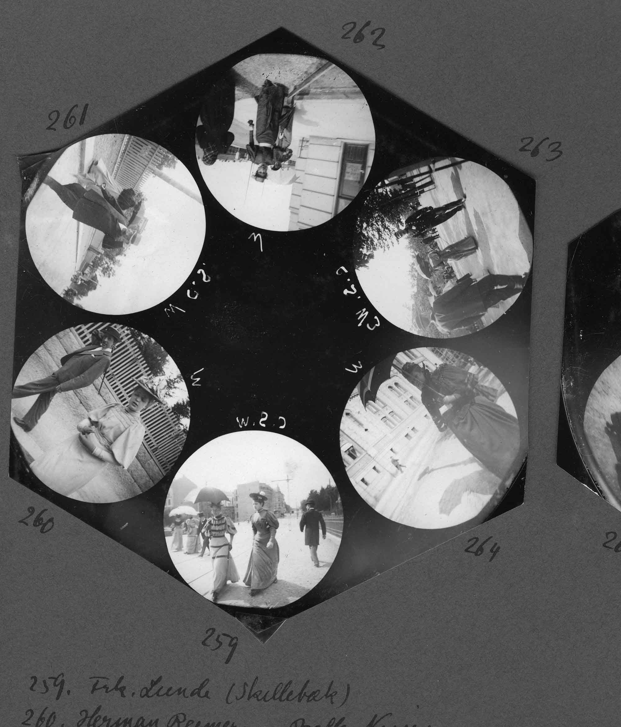 Carl Størmer was a young university student in the 1890s when he began to take secret photographs of street scenes in Oslo. The camera, which was patented in 1886, was disk-shaped and worn around the neck on a chain and positioned under a waistcoat. The lens poked through a buttonhole. On each plate there were six circular negatives, which Størmer rotated with a small knob. When he pulled a concealed string, the camera made an exposure. Størmer had initially bought the camera to take a photograph of a woman whom he had a crush on. (He also took photographs of women swimming.)