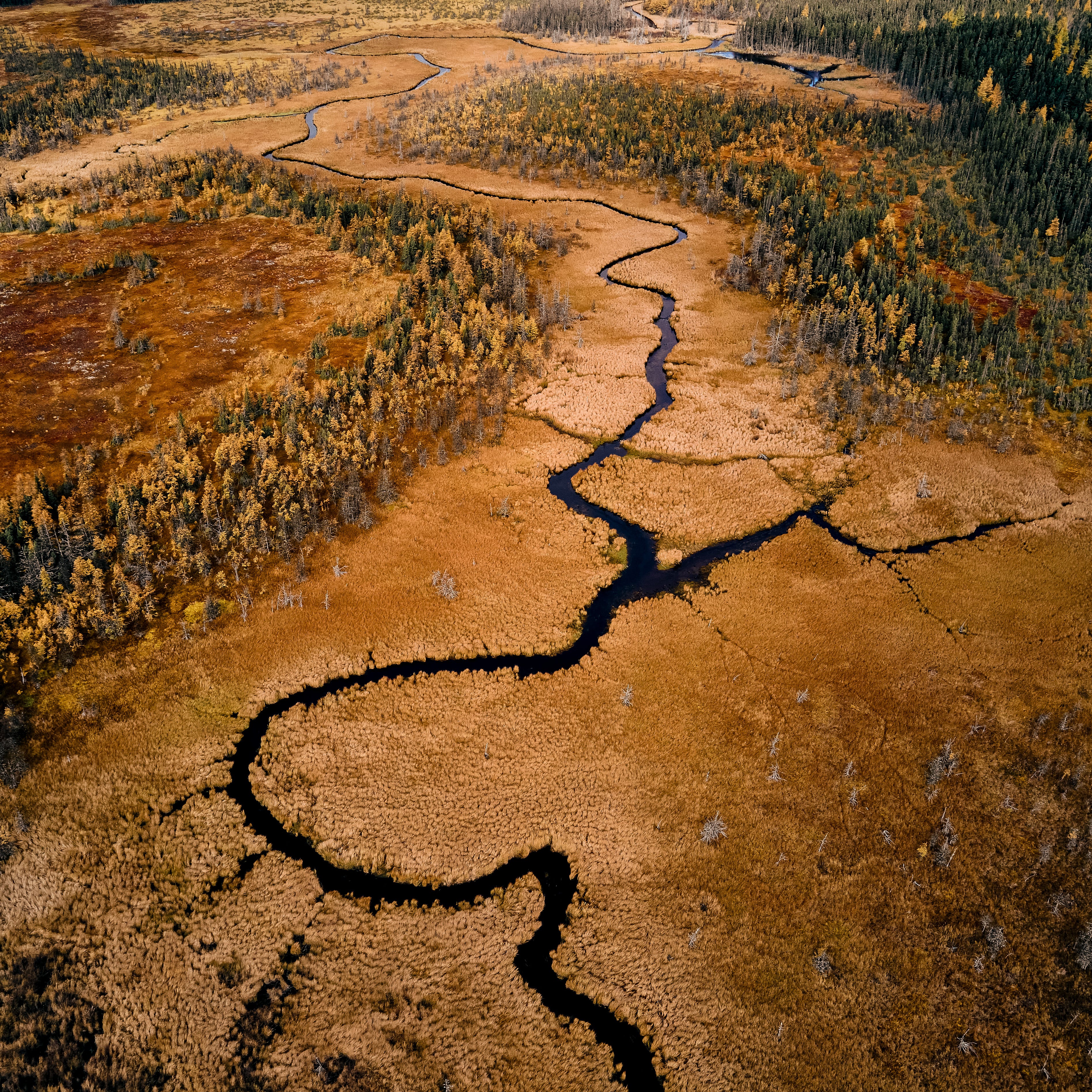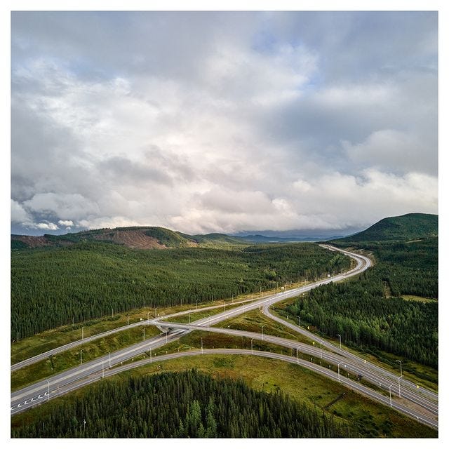 When you are driving there, all you can see on either side of the road are pine trees, larches, and lakes. Of course, in the boreal forest, there are a lot of bogs like this one, but usually, we can’t see them from the road. This one was completely hidden from the road, and even if I had driven this road several times a year for 40 years, I'd never doubted it could be there. A few hundred feet from there, there’s a highway splitting, going to two different cities, and I decided to take the drone to shoot the highway. Here’s the shot: